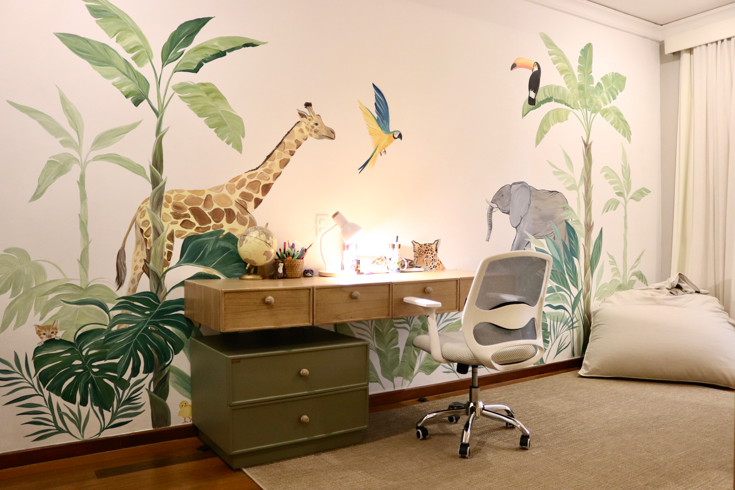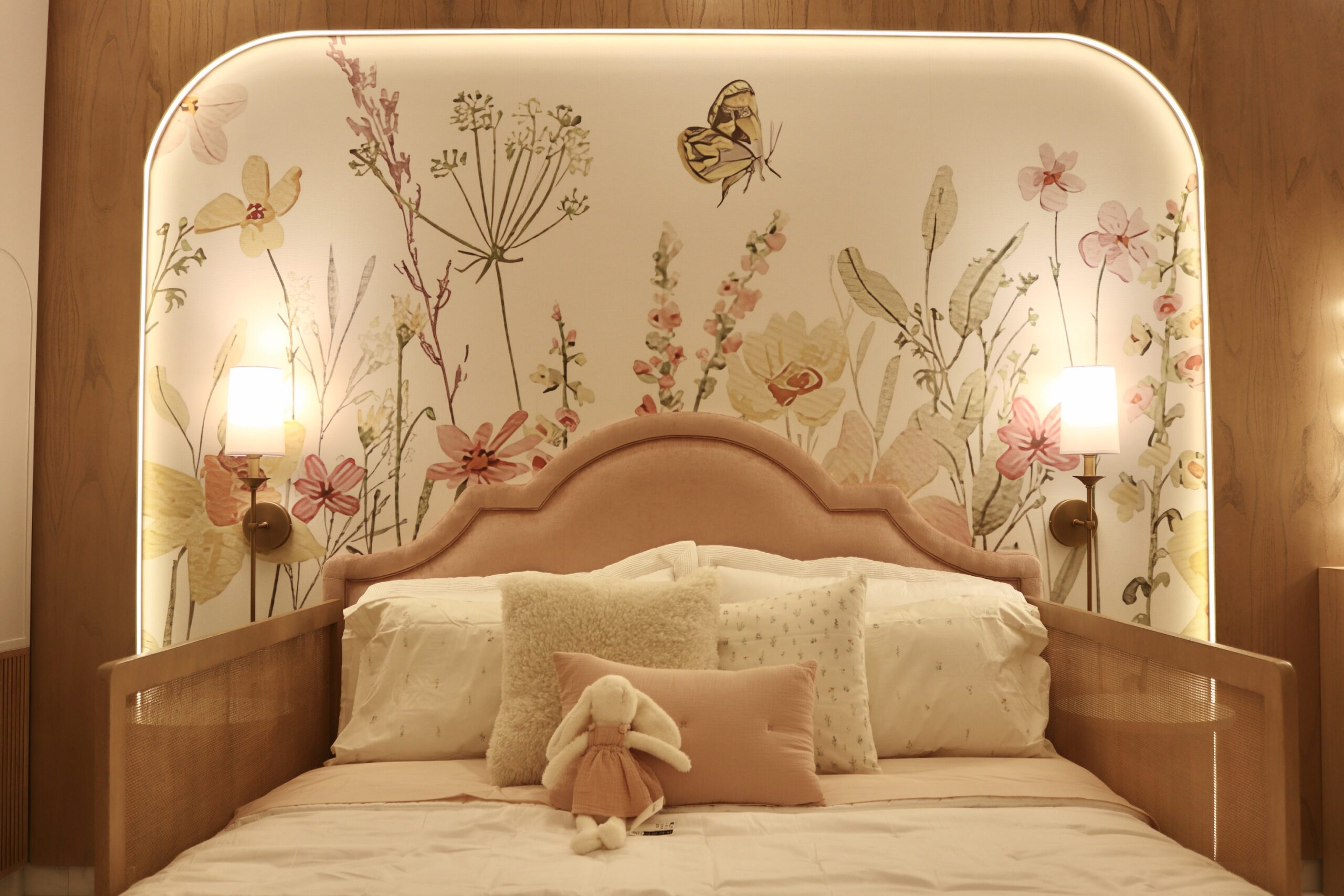 Un espacio mágico y lleno de creatividad, diseñado para un niño de 7 y una niña de 2 años. Elegimos cada detalle, desde la paleta de colores, el diseño del empapelado, las luces, hasta los almohadones decorativos de la cama.