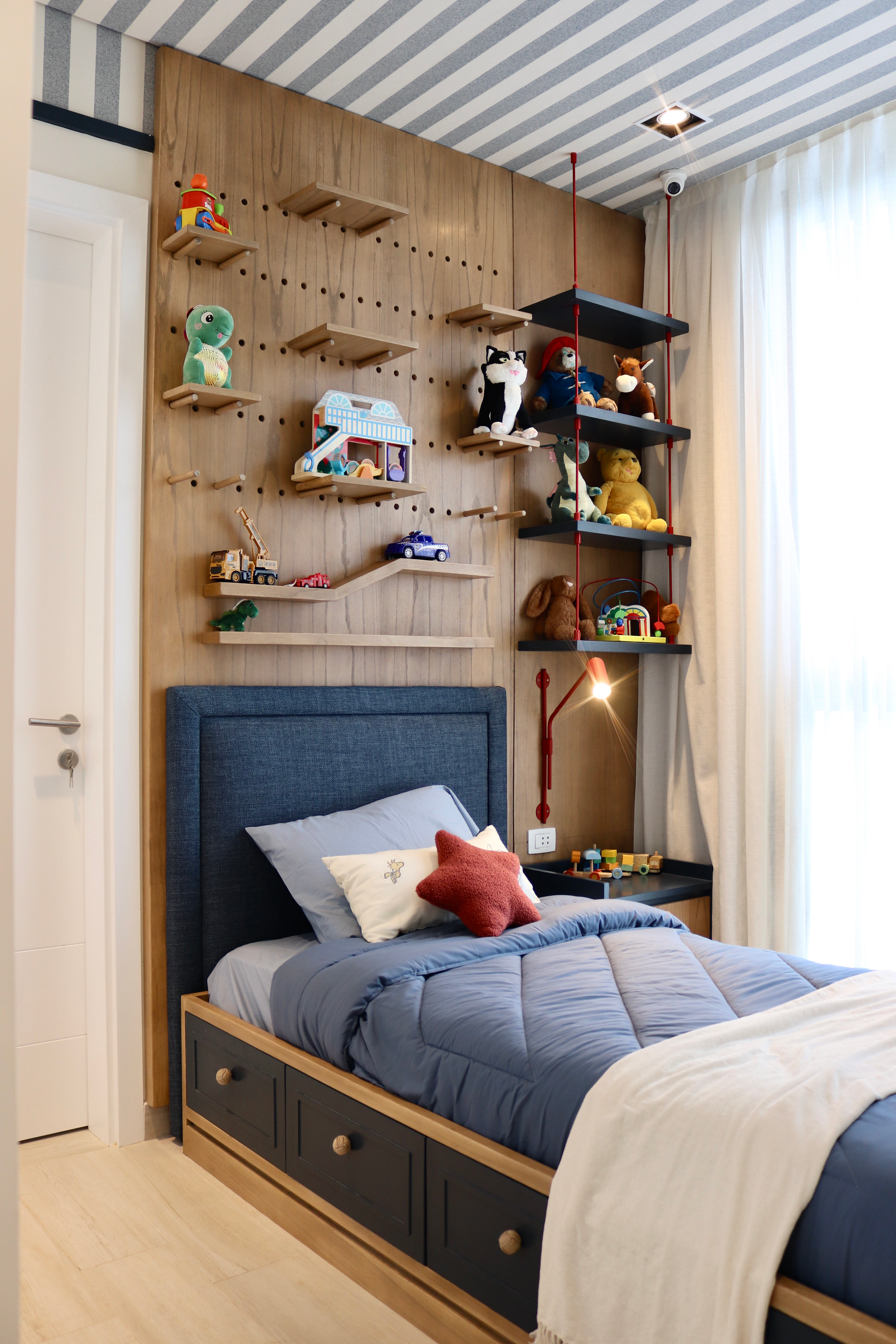 Diseñamos esta habitación con el corazón puesto en cada detalle, pensando en un niño de tres años lleno de imaginación. Con muebles a medida que acompañan su crecimiento, creamos un entorno funcional y cálido: una cama con cajones integrados para mantener el orden, una cabecera tapizada en azul que invita al descanso, y un sistema de estanterías modulares sobre un panel de madera natural que fomenta la autonomía y el juego. La biblioteca vertical con tensores rojos añade dinamismo y color, convirtiendo cada rincón en una invitación a explorar. El techo, empapelado a rayas, cobra protagonismo y ritmo, recordándonos lo importante que es diseñar también para quienes miran el mundo desde abajo. En habitaciones de bebés y niños pequeños, el techo puede ser su primer paisaje, y quisimos que ese paisaje sea alegre y estimulante. La paleta de azules suaves, madera clara y acentos en rojo crea una atmósfera lúdica, serena y acogedora. Este espacio no es solo un dormitorio: es el escenario donde empiezan sus primeras aventuras.