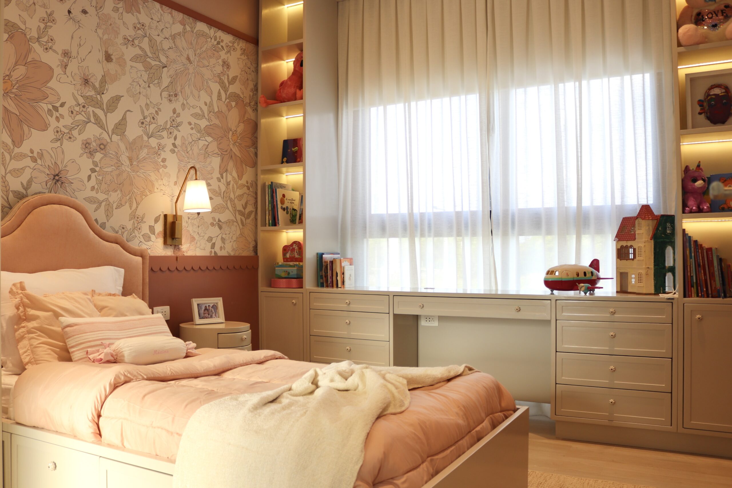 Esta habitación fue diseñada para una niña de 7 años que sueña en grande, pero con los pies bien puestos en su propio mundo. Quisimos alejarnos del típico “cuarto de princesas” y crear un universo en tonos rosa, sí, pero con personalidad, calidez y un estilo que la represente. Incorporamos un revestimiento con volados ondulados que aporta movimiento y suavidad, como si las paredes abrazaran el espacio. El escritorio con biblioteca integrada es perfecto para acompañarla en sus primeras lecturas, juegos y momentos creativos. ¿Y lo más cool del ambiente? ¡Pintamos el techo de rosa! Porque mirar hacia arriba también puede ser inspirador. En Möbel creemos que cada rincón cuenta, y que la infancia merece espacios que alimenten la imaginación y reflejen lo que hace único a cada niño. Esta habitación no es solo un lugar para dormir: es un pequeño refugio donde soñar, crear y crecer.