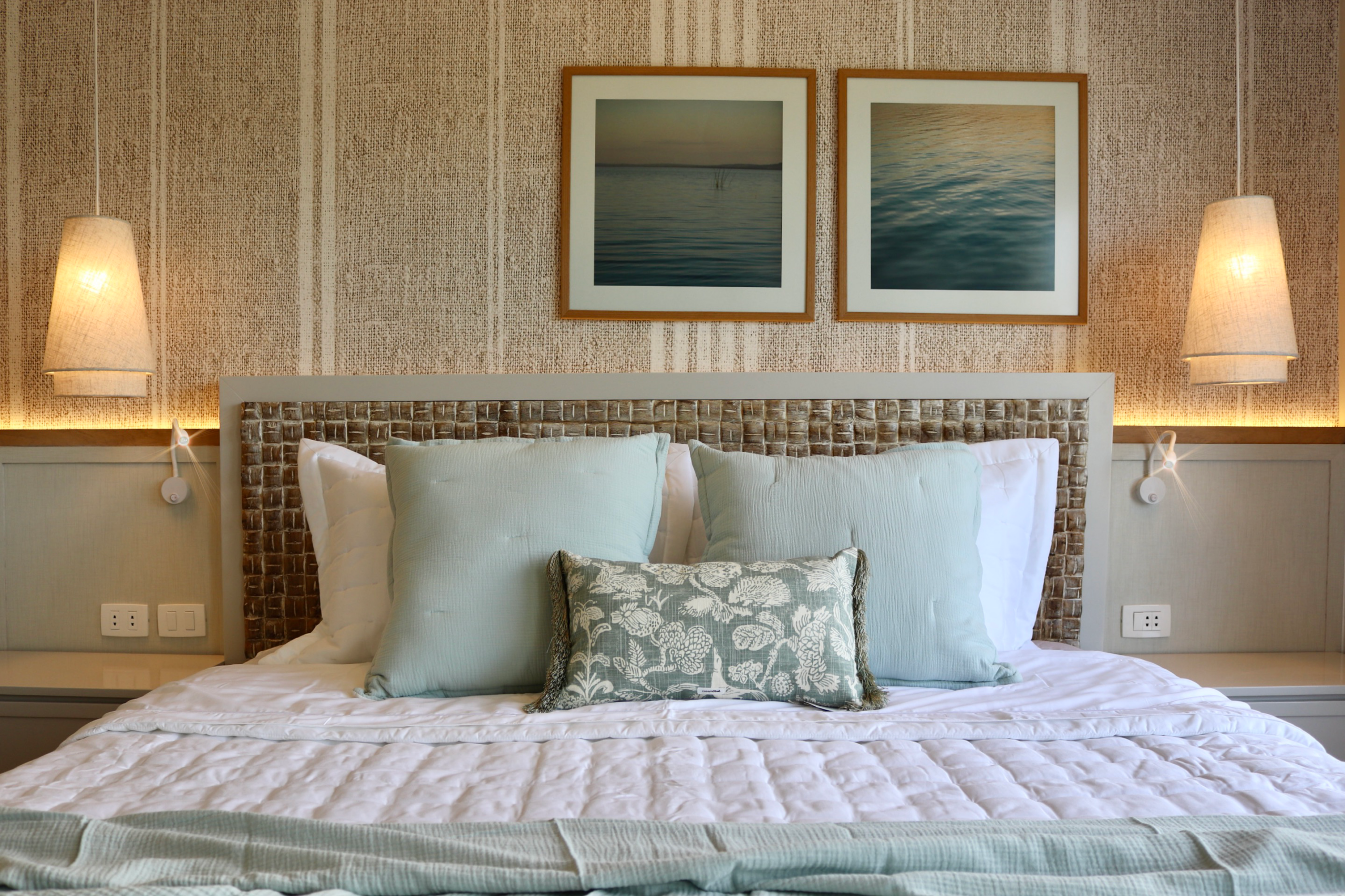 Un dormitorio moderno, con tonos azules y diferentes tonos de gris. ¿Nuestro detalle favorito? El mural pintado a mano especialmente para este cliente.