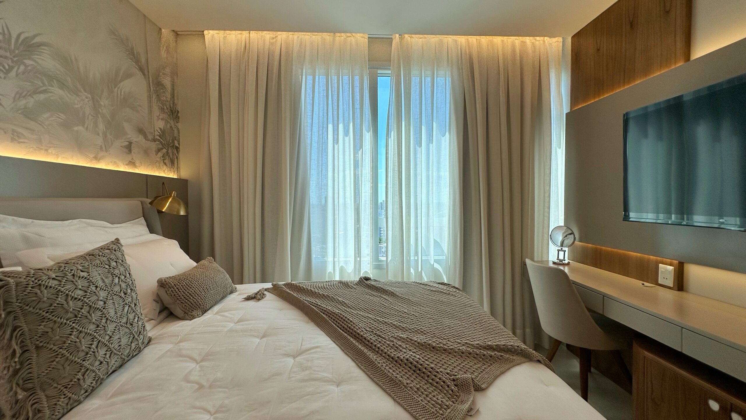 Un dormitorio donde el empapelado a medida y las luces LED hacen la magia. Panel con iluminación LED, base de cama con iluminación LED, empapelado, mesa de noche a medida y panel de TV.