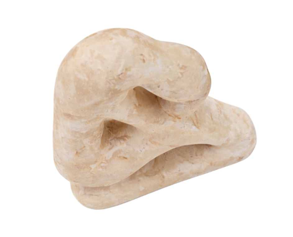 Escultura orgánica de líneas suaves y vacíos sutiles, tallada en piedra clara.